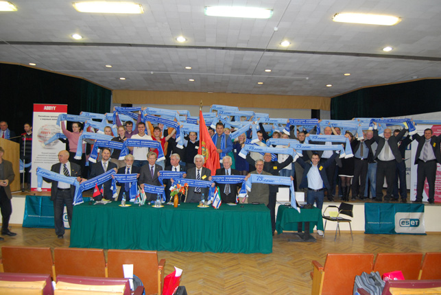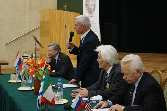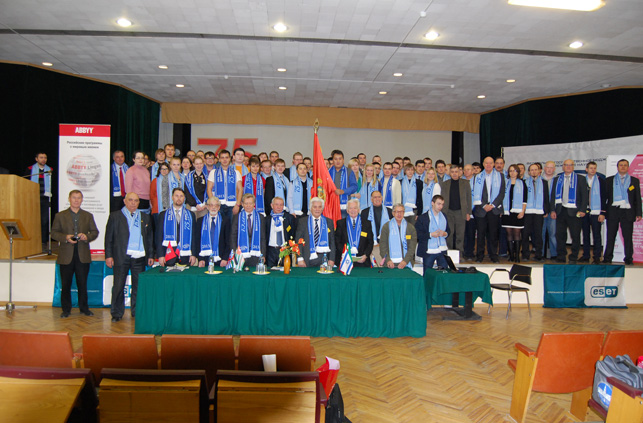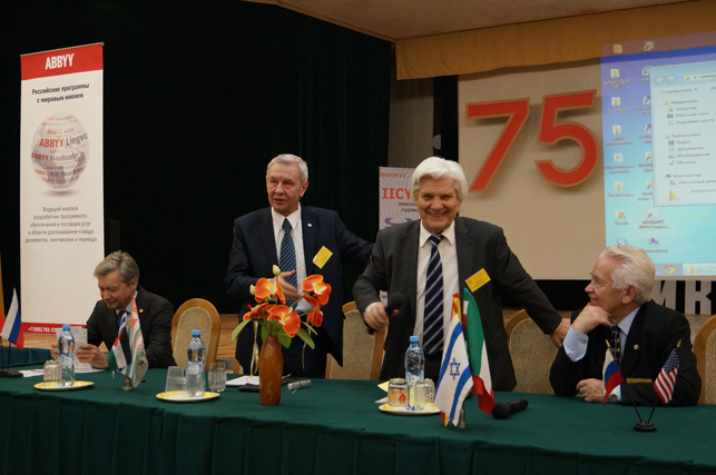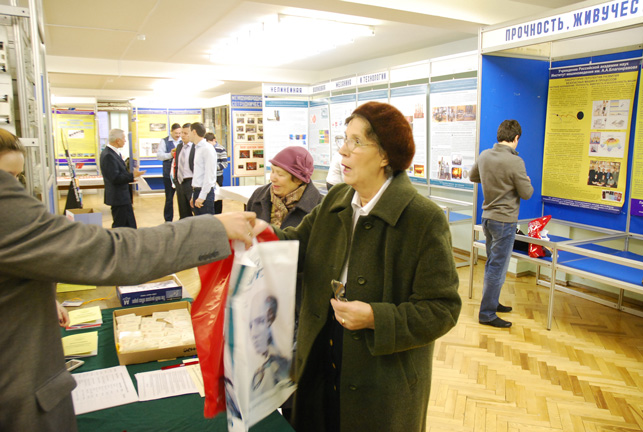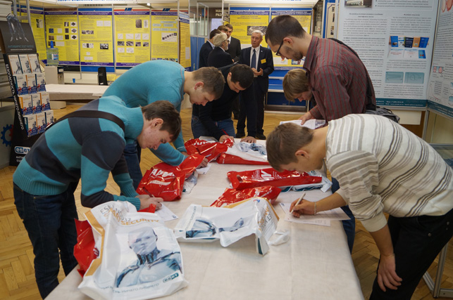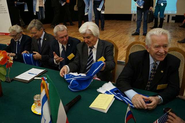 После того, как бурные аплодисменты начали понемногу стихать, присутствующие смогли расслышать о другом, не менее памятном, чем Юбилей МИКМУС, событии – 75-летии ИМАШ РАН. Да, вот так, по чистой случайности, в одном храме науки встретились два Юбилея. В честь Дня рождения Института всем без исключения были подарены памятные шарфы. Что тут началось… Всем (по непонятным мне причинам) вдруг захотелось непременно запечатлеть обновку на фотоплёнке. Пока все желающие приводили себя в порядок, учёные мужи успели провести небольшую научную дискуссию на тему влияния плотности укладки полимерных волокон на потребительские качества исследуемых образцов.